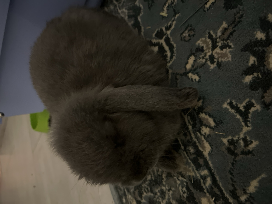 - "A gray lop-eared rabbit rests on a blue patterned rug" by FM-PwRFu2, licensed under CC BY 4.0