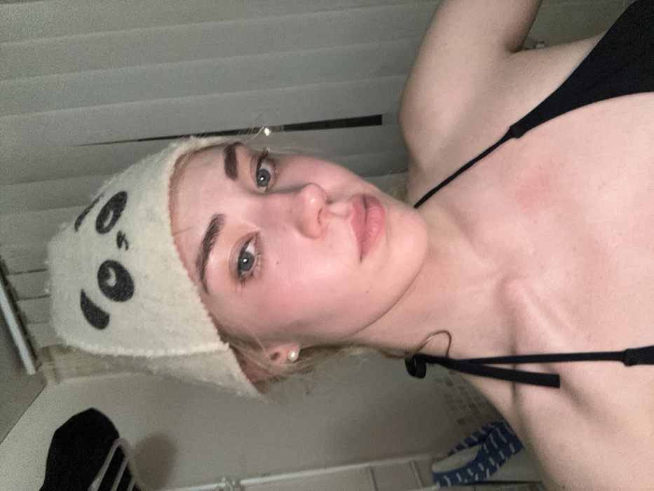 An individual with fair skin and blonde hair is depicted in a close-up, chest-up portrait, likely a selfie, taken in the city of Chaikovsky, Russia. The individual wears a cream-colored, fuzzy hat featuring a black panda face design, typically associated with banyas or saunas. A single pearl stud earring is visible in the left earlobe. A black string bikini top is worn, with thin straps visible over the shoulders. The individual's face, neck, and upper chest exhibit a reddish flush. The individual is looking directly at the camera with a neutral expression. The background is dimly lit and indistinct. To the left, a portion of a tiled wall with a striped blue and white towel or cloth hanging is visible. To the right, vertical elements suggest blinds or wooden paneling. The environment appears consistent with an indoor setting, possibly a banya or changing room.