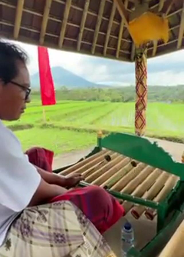 An eye-level shot captures a man seated under a thatched roof structure playing a bamboo xylophone. The man, wearing glasses, a white t-shirt, and a patterned sarong, is focused on striking the bamboo tubes with a mallet. He sits cross-legged, with the xylophone positioned in front of him. The instrument is painted green and filled with hollow bamboo tubes. In the background, a landscape view unfolds: vibrant green rice paddies stretching towards a distant mountain under a cloudy sky. A red flag flutters on a pole to the left of the man. A water bottle rests on the ground near the xylophone's frame. The structure's roof is visible, constructed of bamboo beams.