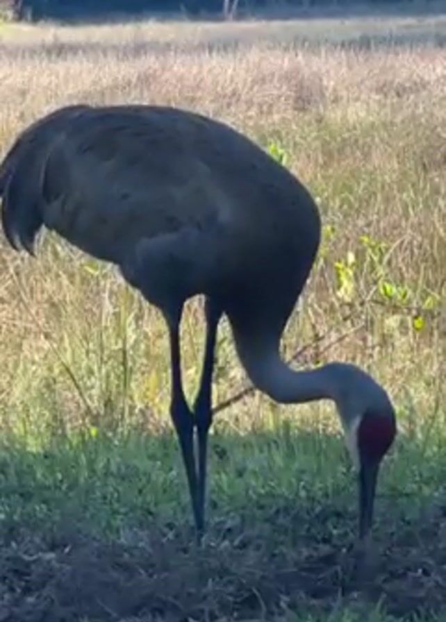 Sandhill Crane foraging in a grassy field