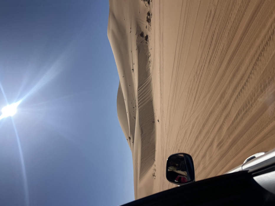 A car's side mirror captures a distorted reflection of a sandy landscape. Tire tracks mark a large sand dune under a bright blue sky with the sun's glare visible. The dune's contours create shadows and light variations on its surface. The car's frame is visible, indicating a ground-level perspective within the scene.