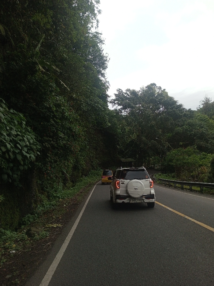 The image depicts a two-lane asphalt road traversing a densely vegetated, rural environment. A light-colored SUV is visible in the midground, viewed from the rear, with a spare tire mounted on its tailgate. The SUV's license plate reads "B 3497 FYZ". Ahead of this vehicle, a yellow sedan is partially visible further down the road. To the left, a steep embankment rises, heavily covered in green foliage, vines, and some exposed rock. The right side of the road is bordered by dense trees and a metal guardrail that extends into the distance. The sky overhead is overcast. No individuals are present. Based on the visible Indonesian license plate ("B" prefix for Jakarta), the scene is located in Indonesia, which contradicts the specified location of Ariyalai, Sri Lanka.