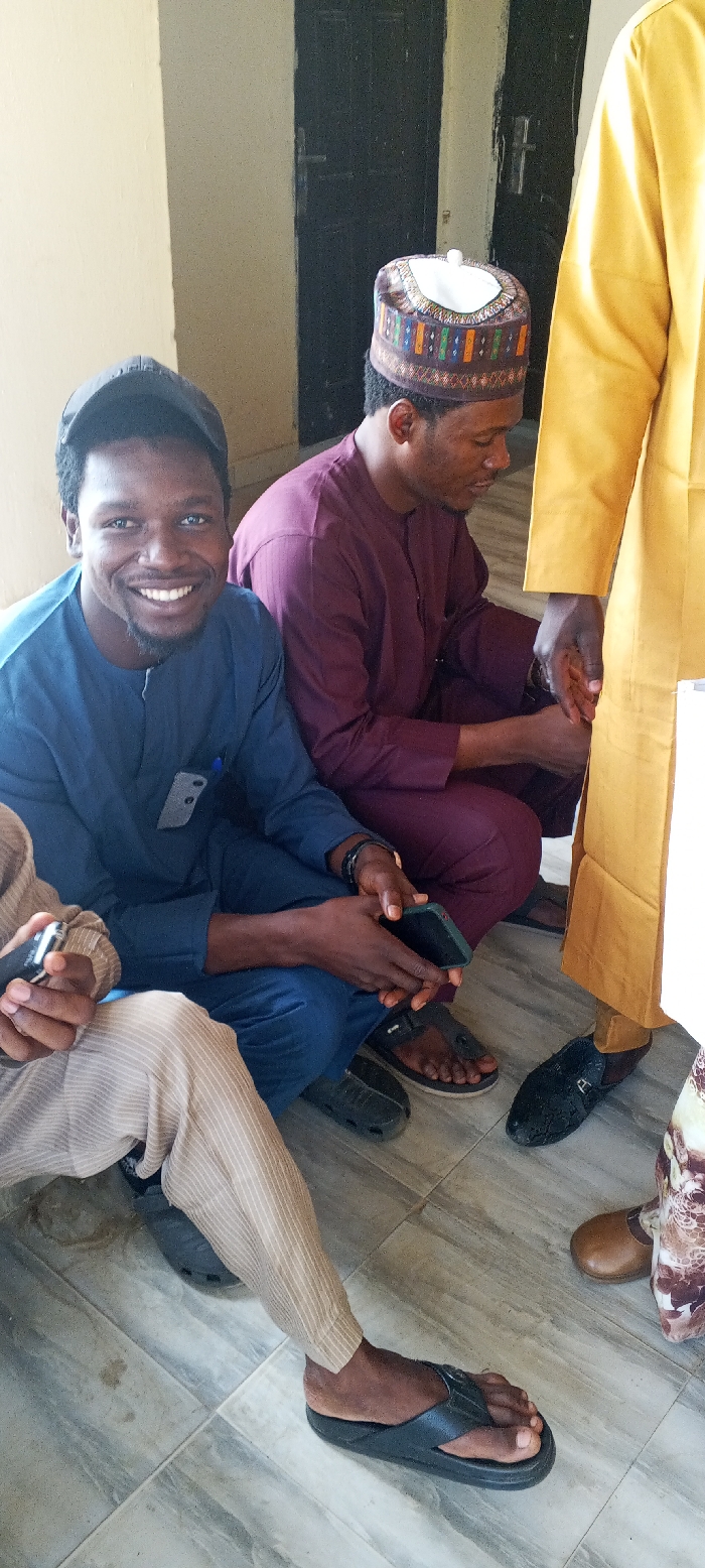 The image depicts an indoor scene in Akwanga, Nigeria, featuring multiple individuals