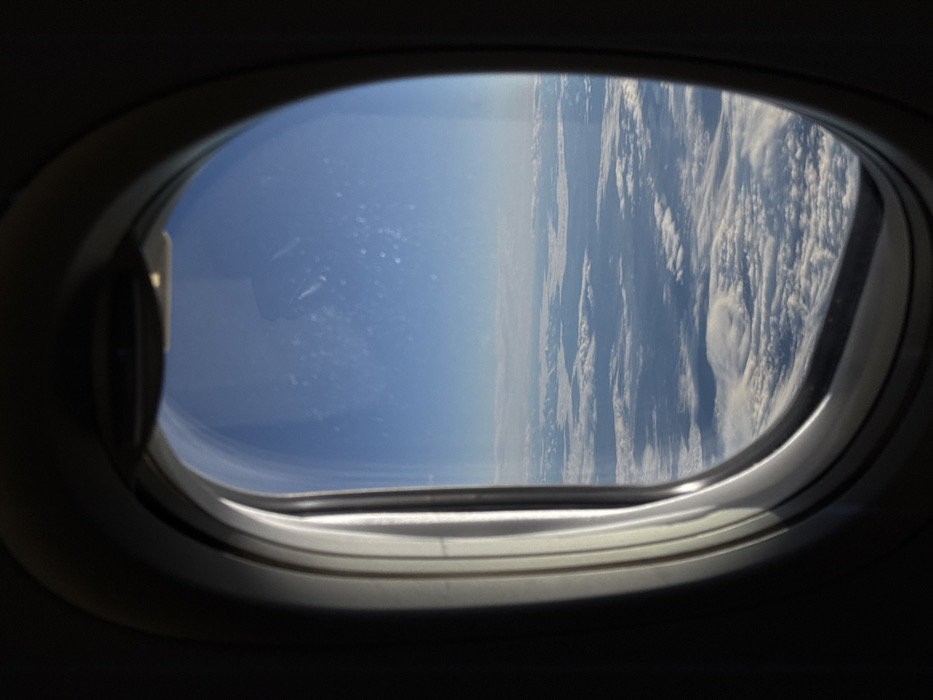 The image presents an aerial view captured through an oval-shaped aircraft window