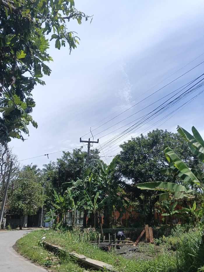A sunny day illuminates a tropical scene. Lush greenery, including banana trees and large leafy trees, thrives alongside a road and a ditch. An electrical pole stands among the trees with multiple wires stretching across the sky. In the ditch, someone appears to be working in the mud. The sky is a mix of light blue and white clouds.