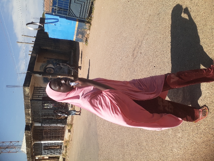 A young individual, appearing female, walks along a dusty road in Jos, Nigeria. She is dressed in a light pink hijab, a matching loose-fitting tunic, dark maroon patterned trousers, and open-toed brown sandals. Her right hand is raised to her mouth, holding a small white, rectangular object. Strong sunlight casts a distinct shadow to her right. In the background, a clear blue sky is visible. To the left, a metallic telecommunications tower is partially obscured by a single-story concrete building with a flat roof and multiple barred windows or doorways. To the right of the road, another single-story concrete building features darker walls, a prominent blue eye mural, and exposed rebar extending upwards from its roofline. Further to the right, a segment of a bright blue wall or gate with a yellow stripe is visible, topped by a circular metallic object mounted on a support structure. Two other individuals are present in the mid-ground near the buildings: one stands to the left of the mural building, wearing a light shirt and shorts, and another in darker clothing stands further right, facing away.