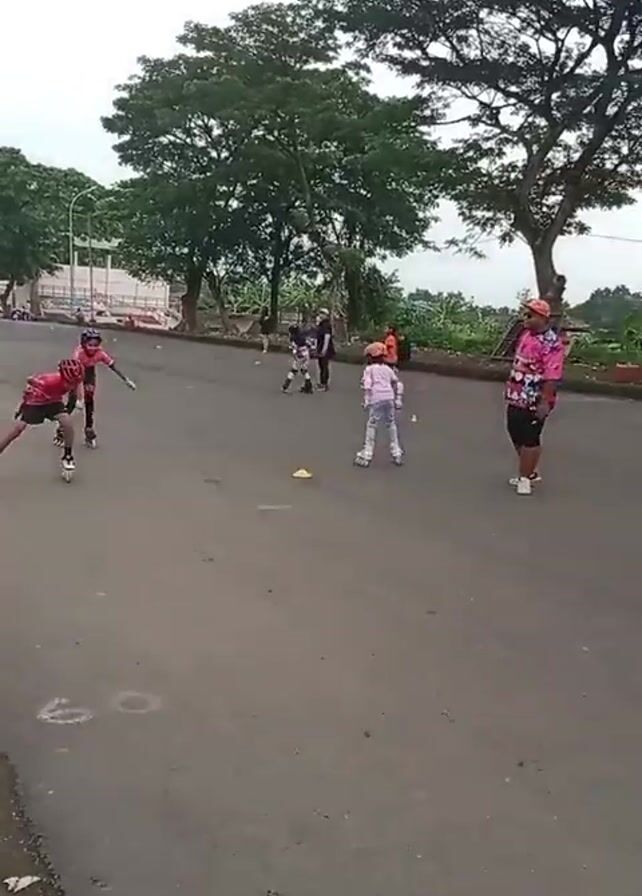 several people roller skating on a paved road. Three children, wearing helmets and protective gear, are actively roller skating around small yellow cones. An adult male, wearing a pink patterned shirt, black shorts, white shoes, and an orange cap, is walking alongside them, apparently coaching or supervising. Other individuals, some seemingly spectators, are standing or sitting on the side of the road near a tree line. The environment includes a paved road, trees, a cloudy sky, and some indistinct structures in the background. One skater trips and is briefly prone.