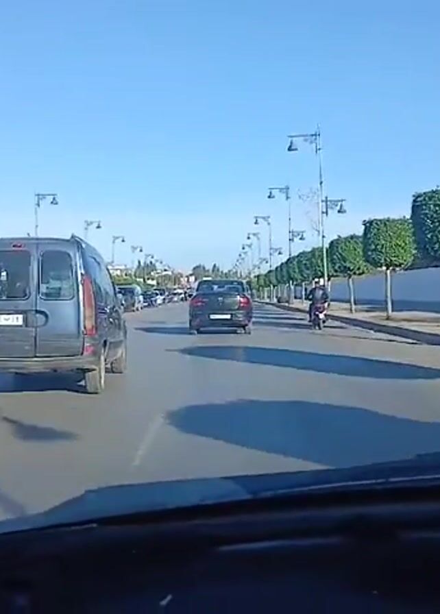 view from inside a car driving on a city street with a row of well-trimmed trees along the sidewalk on the right. There are other cars and a motorcycle moving in the same direction. The sky is clear and blue. The trees are a uniform rounded shape. The street is lined with streetlights. The car's interior is visible in the lower portion of the frame.