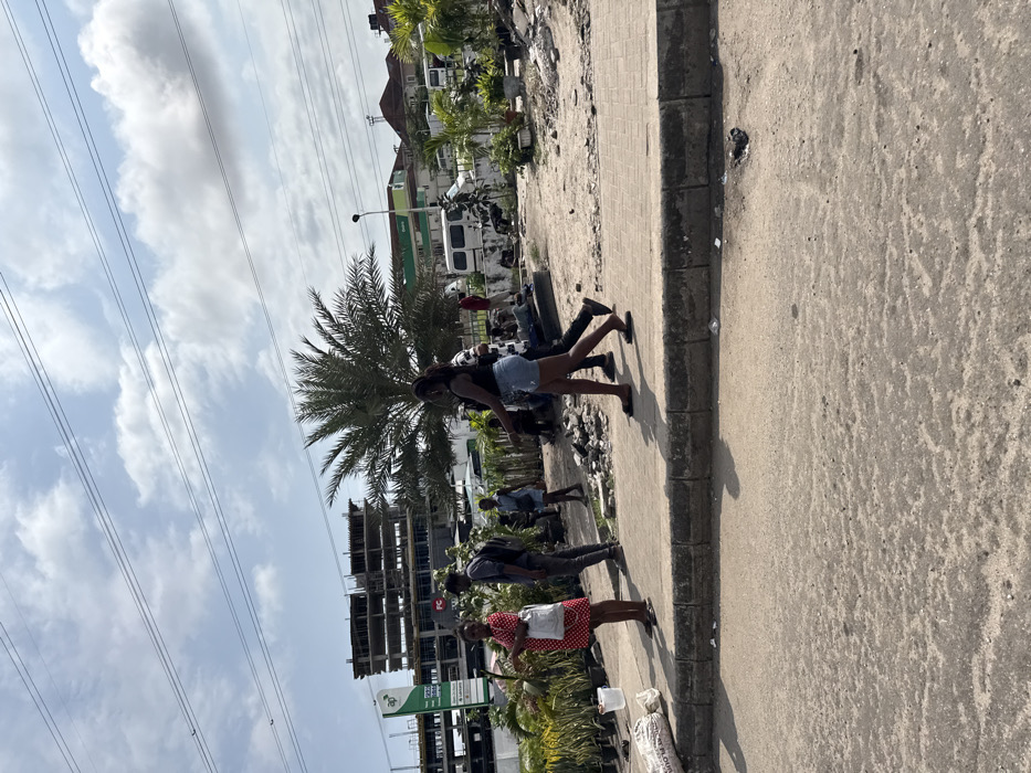 The image depicts an urban street scene in Ilado, Nigeria, under a partially cloudy sky. The foreground features a rough asphalt road leading to a raised concrete sidewalk with gray paver stones and a curb. On the sidewalk, near the left, a white bag, partially labeled "FLOUR," and a white plastic bucket are present. Several individuals are visible on and near the sidewalk. From left to right: * A woman in a red and white polka-dot dress, holding a white bag, stands on the sidewalk, facing right. * Behind her, a man in a dark shirt and pants with a backpack stands facing right. * In the center, a woman with long dark hair, wearing a dark top, denim shorts, and flip-flops, walks to the right. * Adjacent to her, a man in dark clothing walks in the same direction. * Further right and behind, several other people are present; one individual in a light blue denim dress stands, while others are seated on what appear to be discarded tires or rubble on an unpaved area. This unpaved area, located immediately behind the sidewalk on the right, is a makeshift plant nursery, displaying numerous potted plants and small trees. A large date palm tree stands prominently in the middle of this area. Scattered debris and rubble are visible on the ground. In the midground, to the left, a green "AP" sign and a vertical sign with "080," "988," and "FC" are visible. Behind these signs, an unfinished multi-story building, consisting primarily of a concrete framework, is under construction. To the right in the midground, a green and white structure, possibly a gas station, is visible, with several white vans parked nearby. Residential or commercial buildings with brown roofs are seen in the far background. Overhead power lines traverse the upper portion of the sky. The scene is illuminated by natural daylight, casting shadows to the right.