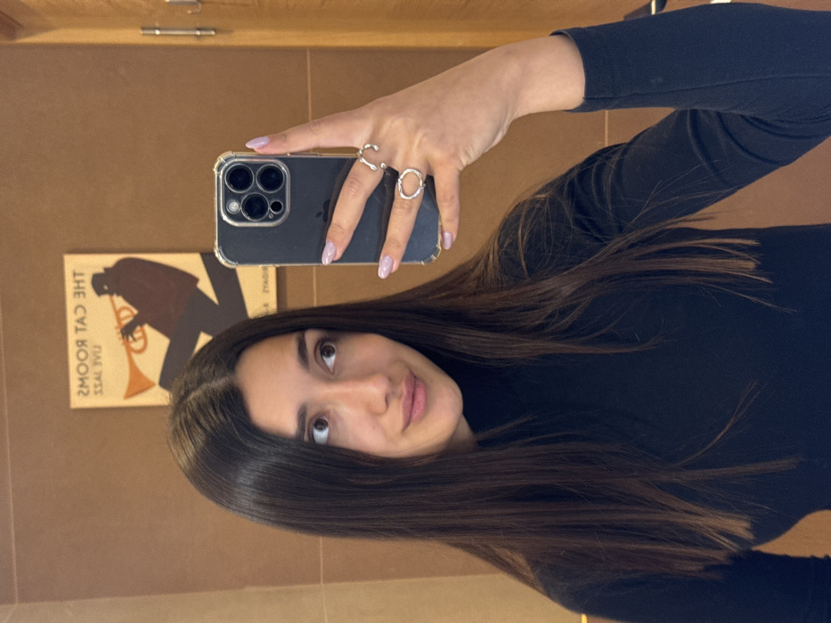 The image depicts a young woman taking a mirror selfie indoors, within a structure in Donja Lastva, Montenegro. The subject is a female, visible from the chest upwards, possessing long, straight, dark brown hair parted down the center. She wears a black, long-sleeved top with a high neckline. Her facial expression includes a slight purse of the lips, with her gaze directed to her right (viewer's left). Her right hand holds a dark-colored smartphone, an iPhone with a prominent three-lens camera module, encased in a clear protective cover. Her fingernails are manicured with a pale purple or lavender polish. Two silver-toned rings adorn her right hand: an open, irregularly shaped oval ring on her ring finger, and an open, curved bar-shaped ring on her middle finger. The background, as reflected in the mirror, is a warm brown-toned wall surface, exhibiting subtle vertical paneling or tile lines. Affixed to this wall is a framed poster, its reversed text reading "THE CAT ROOMS" at the top and "LIVE JAZZ" at the bottom. The poster depicts a dark silhouette of a figure playing a trumpet, set against a lighter background. A metallic fixture, possibly a hook or part of a door handle, is partially visible on the wall to the right of the poster.
