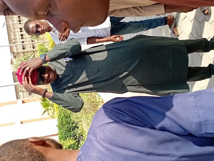 The image depicts an outdoor scene in Kwazailewa, Nigeria, featuring four male individuals under bright daylight. In the center, a male with dark skin, wearing a dark green long tunic over dark trousers, dark sunglasses, a dark wristwatch, and a dark beaded bracelet, smiles broadly while adjusting a dark red cap with both hands on his head. To the immediate left, a male individual in a blue traditional garment is seen from behind, facing the central figure. Behind the central figure and slightly to the right, a third male with dark skin, wearing dark sunglasses, a white long-sleeved shirt, blue denim jeans, and brown sandals, stands with his right hand near his chest, looking towards the central figure. Partially visible in the extreme foreground right is the right side of a fourth male's face, wearing a light-colored garment, also facing the central figure. The ground is paved with light-colored interlocking pavers. The background features a light-colored building with windows and green vegetation including palm trees on the left, and a multi-story building under construction with prominent wooden scaffolding on the right.