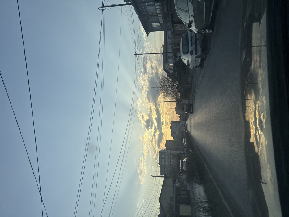 The image displays a street scene in the city of Kostinbrod, Bulgaria, at dusk, viewed from inside a vehicle. The sky transitions from light blue overhead to a bright orange and yellow horizon, where the setting sun's light pierces through scattered cumulus clouds, creating visible crepuscular rays. Numerous overhead power lines crisscross the upper and middle portions of the sky. The asphalt road, appearing somewhat reflective from the low sun, extends into the distance. On the immediate right, a silver Peugeot 206 hatchback and a darker sedan are parked curb-side. Further down the road, multiple vehicles are observed driving away from the viewer. The road's surface shows reflections of the sky and clouds, particularly pronounced from the vehicle's dashboard, visible at the bottom of the frame. Buildings line both sides of the street. On the right, older, multi-story residential structures, one with distinct dark wooden cladding and balconies, are visible, accompanied by prominent utility poles and fencing. On the left side, a mix of low-rise buildings and more substantial multi-story structures form the urban landscape. Sparse, bare trees and shrubs are present along the roadside margins. No individuals are visible within the scene.