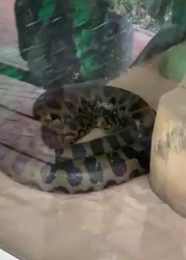 n anaconda in a glass enclosure at an outdoor location. The snake is coiled on the ground, next to a small tree stump. Through the glass, a brick path and green plants are visible. Reflections on the glass show people standing nearby. The video appears to be taken in a zoo or similar facility.