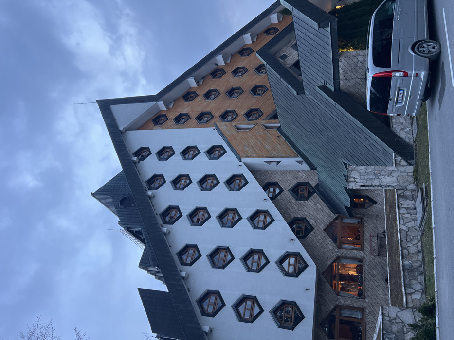 An exterior view depicts a large, angular building, identified as a hotel in Kolašin, Montenegro, under an overcast sky