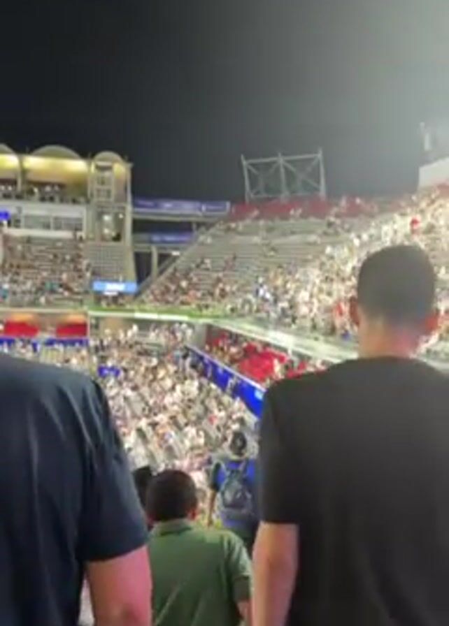 n outdoor sporting event at night with a large crowd in the stands. The perspective is from a slightly elevated position looking down into the stadium. Several people are standing in the foreground, partially obstructing the view of the crowd. A woman in a bright orange dress walks past. The crowd is primarily white and is spread throughout the stadium seating. The stadium is well-lit, and some sections feature colored banners or displays. There is cheering in the background, suggesting an exciting moment in the event.