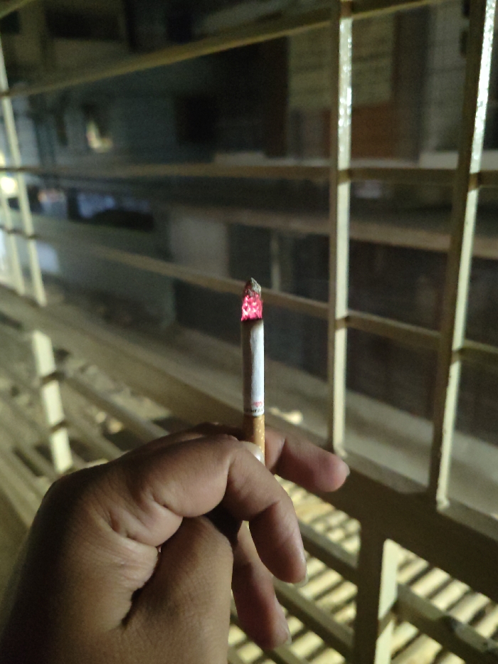A hand holds a lit cigarette in front of a window with horizontal bars