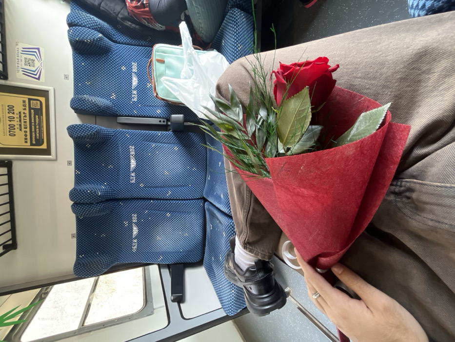 The scene depicts the interior of a Bulgarian State Railways (BDZ) train car, consistent with a location in Donchovci, Bulgaria. A person is seated, with their legs, clad in brown trousers, white socks, and black shoes, visible in the foreground. Their left hand, adorned with a silver ring on the ring finger, holds a bouquet featuring a single prominent red rose surrounded by green foliage, wrapped in red textured paper. The bouquet rests on the person's lap. To the right of the person, a row of unoccupied blue patterned train seats is visible, each embroidered with the "БДЖ BDZ" logo. A light mint green lunch bag and a clear plastic bag are placed on the seat immediately adjacent to the person. Further to the right, the legs of another passenger in dark clothing are partially visible. Overhead, a framed sign in Bulgarian displays "ИНФО ЦЕНТЪР БДЖ" (BDZ Info Center) with the phone number 0700 10 200 and a QR code. A smaller sign to its right reads "ЧЕТИ ВЪВ ВЛАКА" (Read on the train). A window on the left side of the train car offers an indistinct view of the exterior.