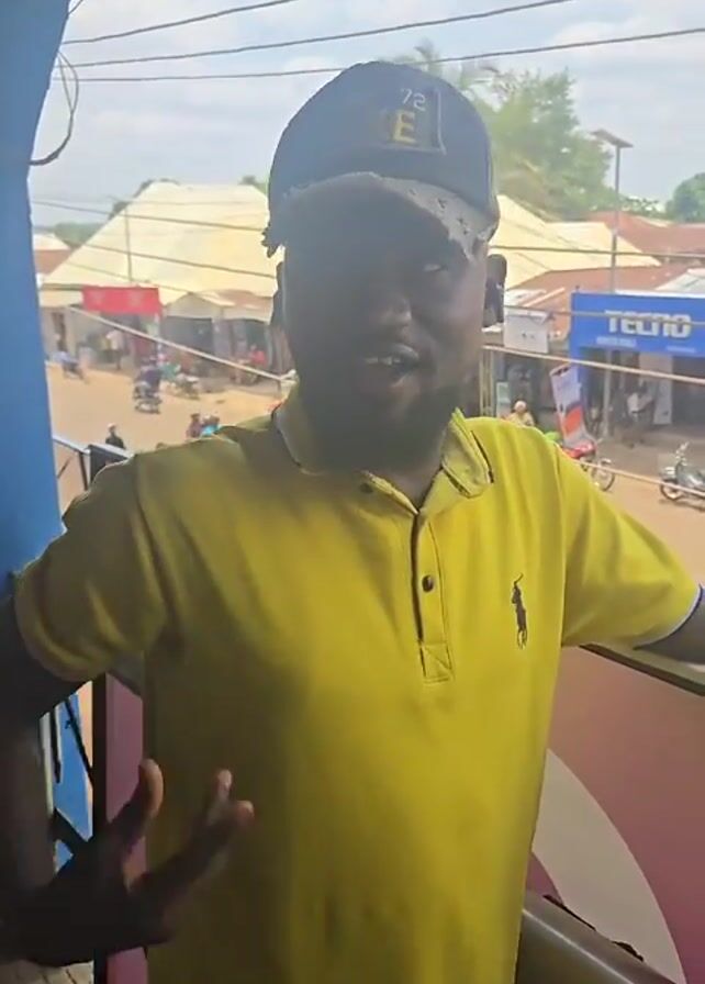 A man in a yellow polo shirt and a black baseball cap stands on a balcony overlooking a busy street. He speaks to the camera briefly and then turns to look at the street scene. There are buildings and shops visible on the street, and motorcycles and people are moving around. The day is bright and sunny.