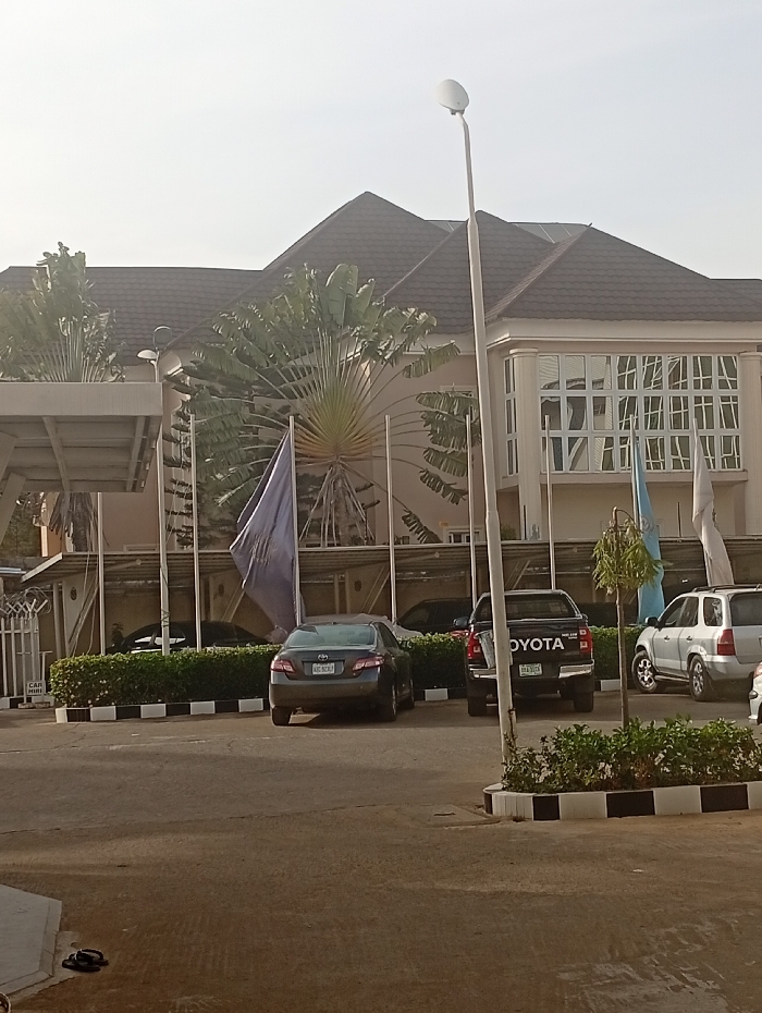 The image depicts an outdoor parking area located in Unguwar Sarki, Nigeria, under a bright, clear sky