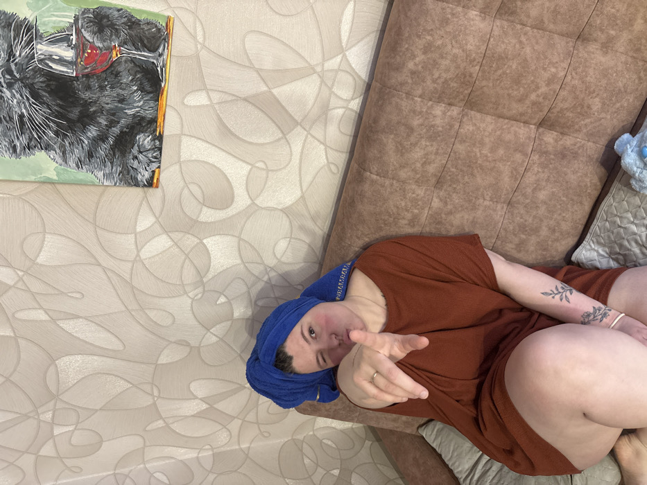 This image depicts an individual seated on a light brown upholstered couch in an indoor setting, identified as Chaikovsky, Russia