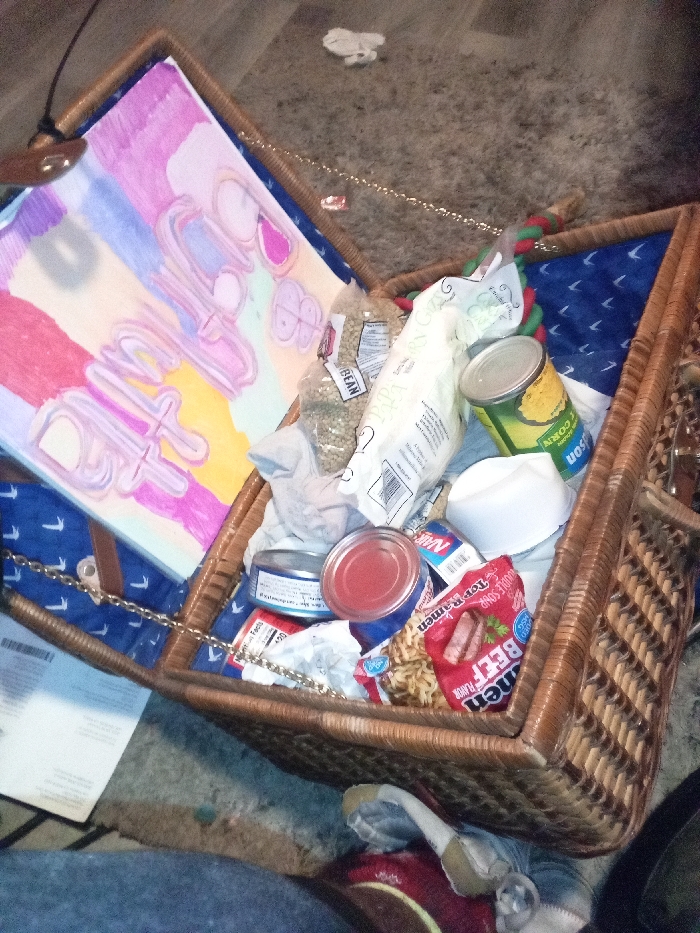 The image displays an open, light brown wicker basket resting on a dark gray carpeted floor in Los Angeles, United States. The basket's interior is lined with blue fabric featuring a white pattern, possibly depicting anchors or similar shapes. A gold-colored chain is visible, connecting the basket's side to its lid. Attached to the inside of the lid is a piece of paper or cardboard with the phrase "Happy Bday" rendered in multi-colored bubble letters, specifically pink, purple, yellow, and red. The basket is filled with various items, primarily food products. These include a clear plastic bag containing what appears to be dried lentils or beans, a large white bag of unidentifiable contents, a green and yellow can labeled "SWEET CORN," a small silver can, a red-topped can, a white plastic cup or container, and a red package of "TOP RAMEN BEEF" flavored instant noodles. A red and green twisted fabric object, resembling a rope or toy, is also present among the contents, along with crumpled white paper. In the immediate surroundings, a portion of a person's leg clad in blue jeans is visible in the lower-left foreground. A white piece of paper with black text lies on the carpet to the left of the basket. In the lower-right foreground, part of a red and white shoe or slipper is partially obscured by the basket. A small, crumpled white object is discernible on the carpet behind the basket. The scene is static, with no active interactions depicted.
