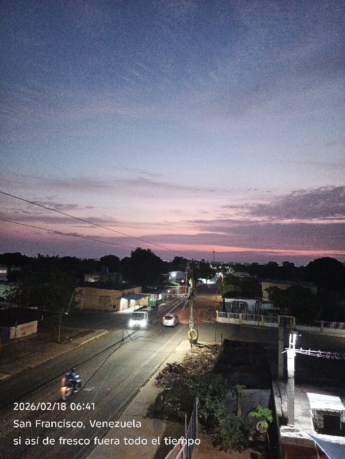 This image displays an urban street scene in San Francisco, Venezuela, captured at 06:41 on February 18, 2026. The sky presents a dawn gradient, transitioning from deep blue overhead to light blue, pink, and vibrant orange-pink near the horizon, with scattered, wispy clouds visible. Numerous black utility lines traverse the upper and mid-sections of the frame. A two-lane asphalt road, illuminated by activated streetlights, extends through the midground. One individual is operating a motorcycle traveling towards the camera in the left lane, its headlight illuminated. In the right lane, a white van or truck with active headlights and a lighter-colored car with illuminated taillights are traveling away from the camera. The environment immediately bordering the road consists of dirt shoulders; a patch of debris is visible on the right shoulder. Several utility poles, supporting streetlights and a yellow circular fixture on one pole, line the street. Low-rise buildings, appearing to be residential or commercial with light-colored facades and various roof types, are situated on both sides of the road, interspersed with trees and vegetation. Distant urban lights and faint structures are visible against the horizon.