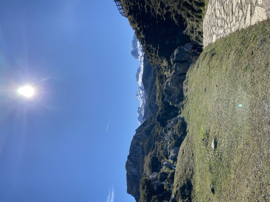 The image depicts a mountainous landscape within the Picos de Europa National Park, in the vicinity of Cangas de Onís, Spain. The upper two-fifths of the frame show a clear, brilliant blue sky containing a prominent, flaring sun in the upper center and a faint white aircraft contrail positioned horizontally in the upper left. A range of snow-capped mountain peaks stretches across the mid-ground horizon. The foreground and mid-ground consist of rolling terrain covered in sparse green grass, dark green low-lying vegetation, and scattered grey rock formations. A light-colored, irregularly paved stone path curves from the lower right corner of the image, ascending towards the center-midground. Two individuals are present on this path in the lower right quadrant. The leading figure is an adult male, viewed from behind, wearing a grey t-shirt and dark trousers. A smaller figure, likely a child, walks directly behind and slightly to the left of the adult. On the far right edge of the image, a dark wooden post-and-rail fence runs along the crest of a steep, vegetated slope. The scene is brightly illuminated by direct sunlight, indicating clear weather conditions.