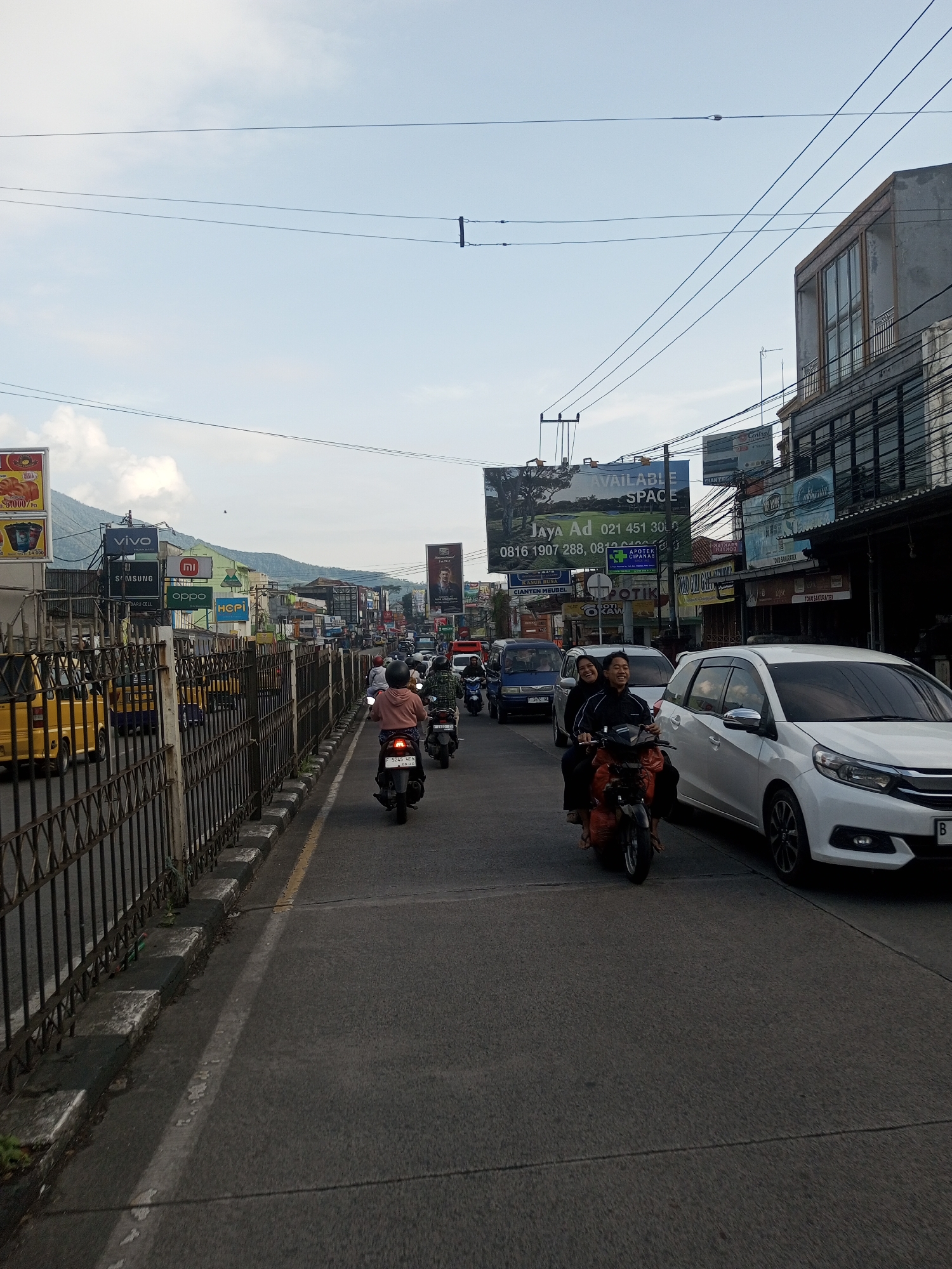 The image captures a busy street scene in what appears to be an urban or semi-urban environment. Motorbikes and cars navigate a congested road, indicating heavy traffic. Along the roadside, a metal fence separates the road from the pedestrian walkway, and numerous commercial signs and billboards are visible, advertising various products and services, including mobile phones and real estate. Overhead, power lines crisscross the sky. In the foreground, two people are riding a motorbike, with another motorbike following behind them. A white car is parked on the side of the road. Mountains are visible in the distance, suggesting a location near a mountainous area. There is no evidence to suggest that the image was taken in Mya Sit Kaing Ywar Thit, Myanmar.