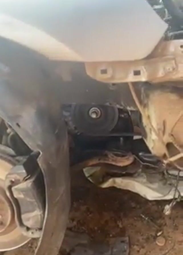 A damaged silver-colored car is shown in a video. Its front bumper and headlight are missing, revealing the engine compartment. The engine is visible with various components, including hoses, belts, and pulleys. The front left fender is also damaged and hanging loosely. The car appears to be undergoing repair or maintenance in a garage or outdoor setting. A person's hand is briefly visible near the front of the car at the end of the video.