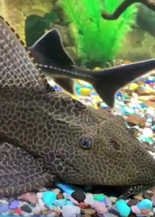 freshwater aquarium containing several fish. In the foreground, a large plecostomus lies on the bottom of the tank, which is covered with colorful gravel. Behind it, a sturgeon swims past. Artificial plants and decorative elements such as a castle and driftwood provide additional visual interest within the tank. The camera pans to follow the sturgeon as it moves through the aquarium.