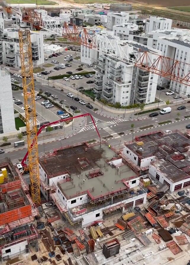 construction site where a concrete pour is taking place. Several construction workers in hard hats and vests can be seen on the rooftop of a low-rise building. A red boom of a concrete pump truck extends over the building and is dispensing wet concrete. The workers are using tools to spread and level the concrete over a grid of rebar. The building is bordered by a red railing. The surrounding area features additional construction sites, newly built white apartment buildings, a parking lot, and a two-lane road with some traffic. In the background, there are fields and distant structures under a cloudy sky. Cranes are visible among the buildings.
