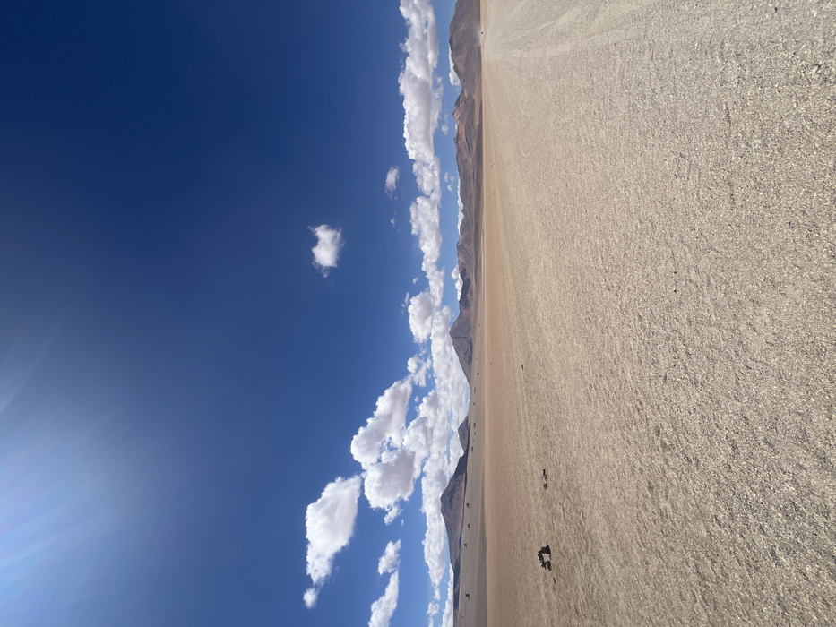 A desert landscape under a brilliant blue sky dotted with fluffy white clouds. The flat, sandy ground stretches to the horizon, where a series of low, brown mountains meet the sky. The sun shines brightly, casting a soft glow over the scene. A few scattered dark objects are visible on the desert floor.