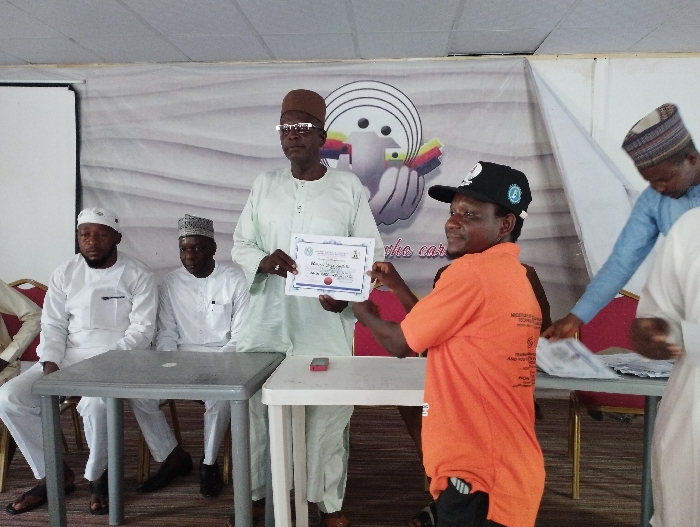 n award ceremony taking place in Gombe, Nigeria (coordinates: 10.294, 11.124). There are four men, three seated and one standing. The seated men are wearing white traditional garments and white caps. The standing man is wearing a light green long-sleeved shirt and a white cap. He is holding a certificate in his right hand. Another man, standing in the foreground, is wearing a black cap, a bright orange t-shirt, and dark pants. He is receiving the certificate from the man in the green shirt. There is a table in front of the seated men, with two white chairs. The environment is indoors with a white ceiling and walls, and a colorful banner behind the men with the words "who care" written in black. The banner is on a white backdrop. There is a large, white screen hanging behind the seated men.