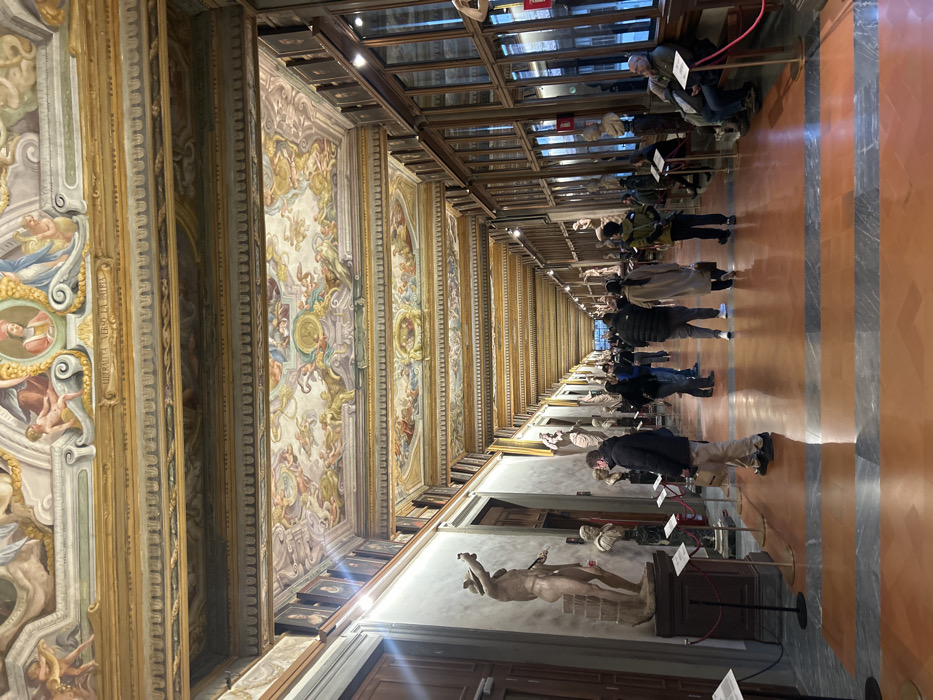 The image depicts a long, ornate gallery within the Uffizi Gallery in Florence, Italy