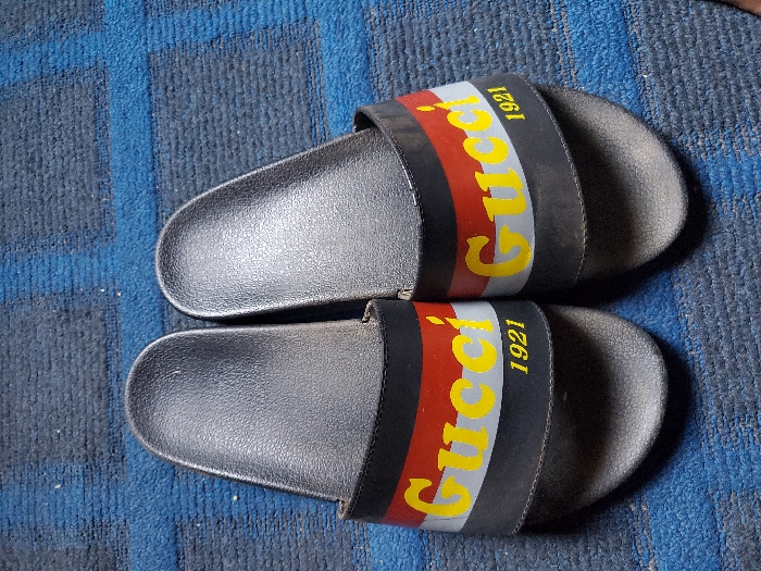 A pair of black slide sandals rests on a blue textured surface with a subtle grid pattern, potentially a mat or rug, within Akwanga, Nigeria. Each sandal features a black sole and a wide black upper strap. The strap is adorned with a horizontal design comprising a central red stripe bordered by two lighter grey stripes. The word "Gucci" is prominently displayed in yellow capital letters across these stripes, with the number "1921" in smaller yellow numerals positioned below it. The footwear exhibits signs of wear and minor dust accumulation on both the sandals themselves and the underlying blue material. No individuals or actions are depicted in the scene.