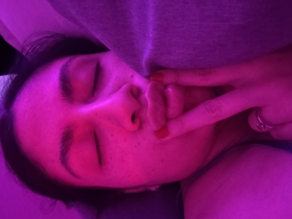 A person lies with closed eyes, illuminated by purple light. Their face is freckled. A hand with red nails holds their lips in a pout. A ring adorns one finger. A gray garment is near their face. A delicate necklace is barely visible on their neck. The scene has a dreamlike, intimate quality.
