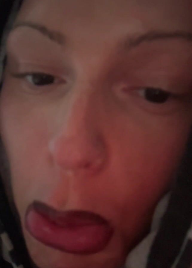 A close-up video shows a person wearing dark lipstick and a hooded sweatshirt. The person speaks, stating that they were supposed to go out this evening but are too sick. Their eyes are droopy and they appear tired.
