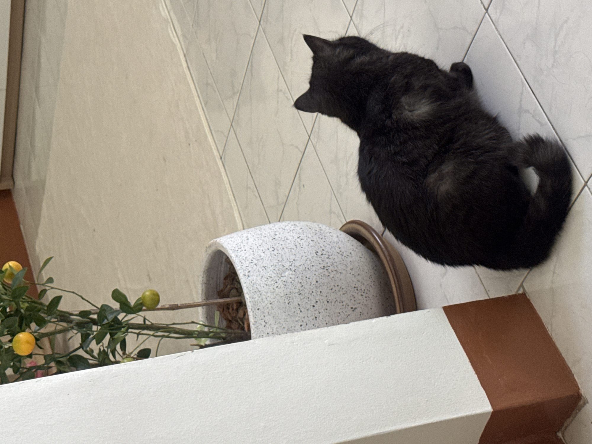 A black cat lies on a tiled floor in a room in Choeng Thale, Thailand. It is positioned near a white and brown ledge holding a plant in a speckled white pot. The plant has green leaves and small yellow fruits. The floor tiles are light-colored.