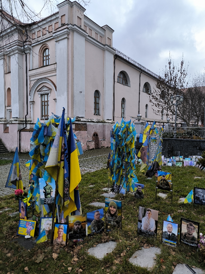 The image displays an outdoor memorial situated on a grassy area next to the St. Nicholas Orthodox Church in Vinnytsia, Ukraine. The church, a multi-story building visible in the background under an overcast sky, features a light pink facade with white architectural elements including prominent pilasters and arched windows. In the foreground and midground, a commemorative display occupies a patch of grass. Numerous Ukrainian national flags, colored blue and yellow, are tightly clustered and tied to several upright, bare metal structures, creating dense, tree-like forms. Additional individual Ukrainian flags are positioned amongst these structures. Multiple framed or mounted portraits of individuals, primarily young men, many in military uniforms, are arranged on the grass. These portraits are spaced out, some propped individually, others in small groupings. Small, light-colored stepping stones are visible embedded in the grass. A single red rose is placed near one portrait on the left side of the frame. No individuals are present in the scene.