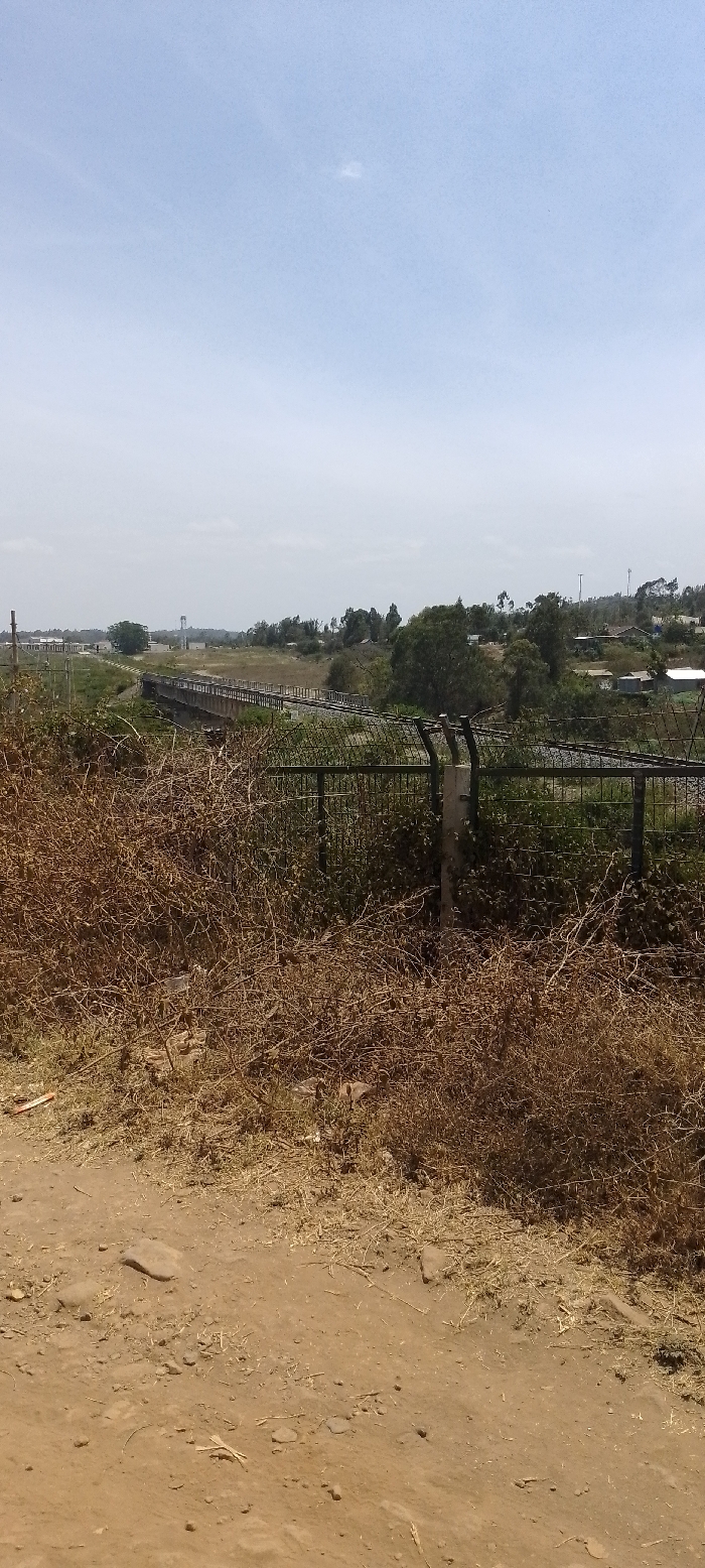 A landscape with a dirt path in the foreground and a wire fence in the midground. Dry, brown vegetation obscures parts of the fence. Beyond the fence, a railway bridge crosses a low-lying area with scattered trees and vegetation. In the distance, structures and houses are visible, and a pale sky fills the upper part of the frame.