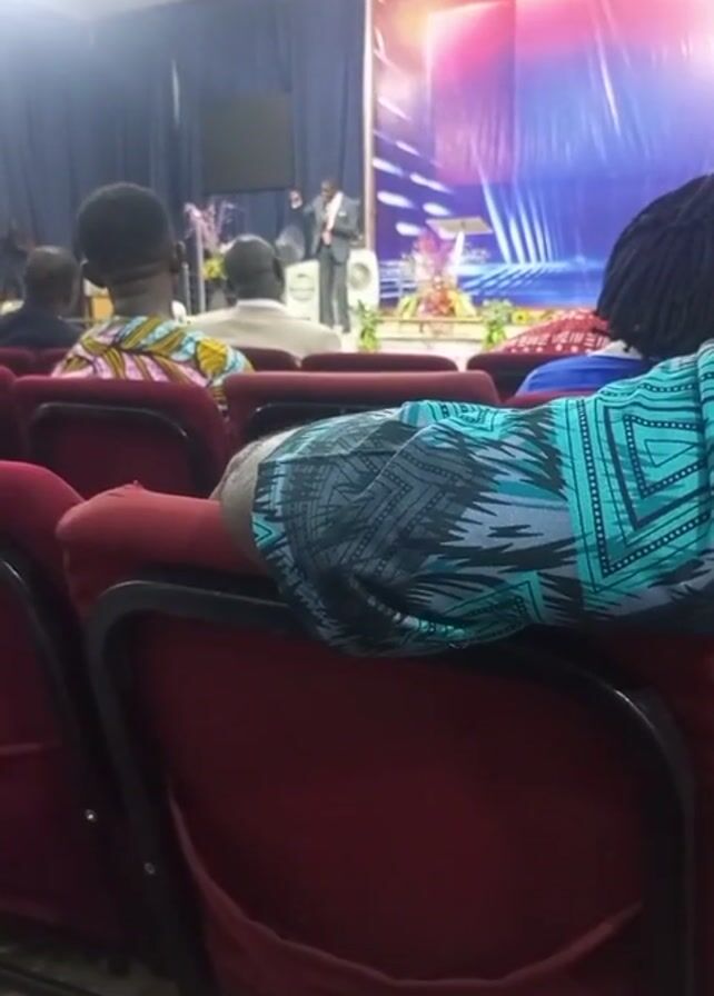 interior of a church. A man in a dark suit is standing on a stage at the front of the room and appears to be giving a sermon. The stage is decorated with flowers and a screen that displays colors and a design. A handful of people are sitting in red chairs in the audience, facing the stage. The person recording the video is also seated in a red chair. The room is well lit. The person speaking on stage gestures with his hands as he talks.