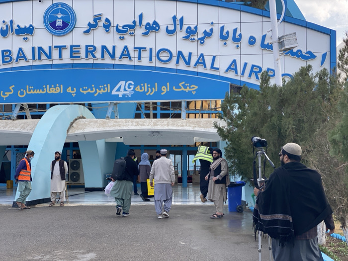The image presents the exterior of Ahmad Shah Baba International Airport in Kandahar, Afghanistan