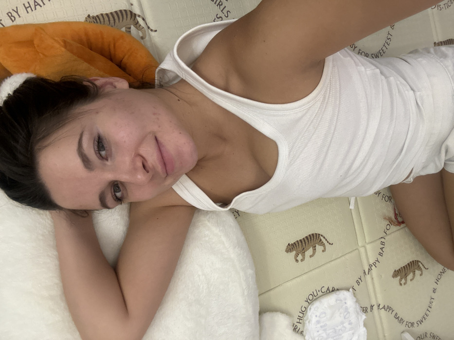 A woman lies on a patterned surface featuring tiger illustrations and baby-related text. She is resting her head on a white pillow and has an orange item nearby. She's wearing a white tank top and shorts. Her face is visible, showing her features with a slight smile. The surrounding area includes what appears to be a diaper.