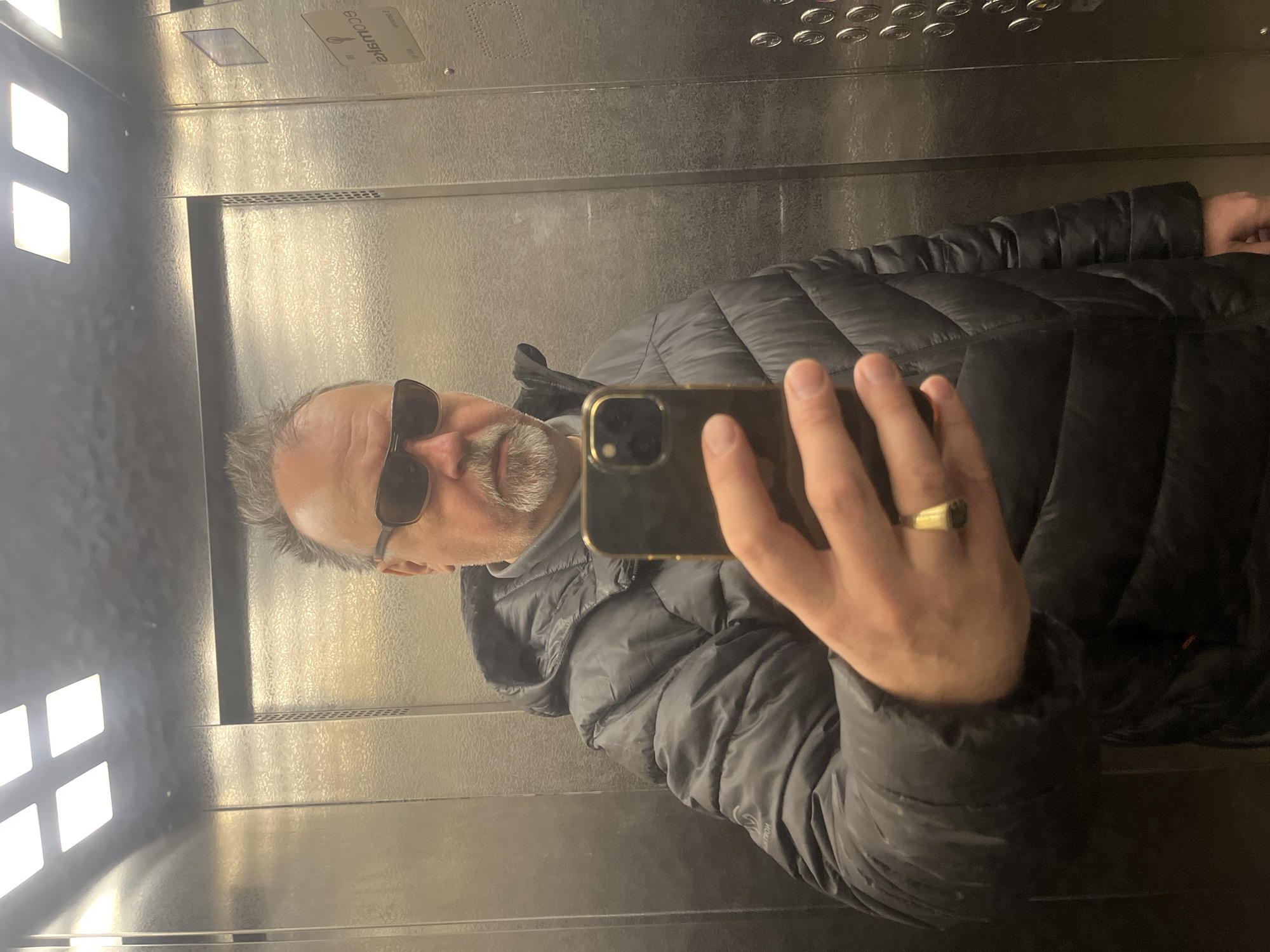 A man with gray hair, a gray goatee, and wearing sunglasses is taking a selfie in an elevator. He is wearing a black puffer jacket and a gold ring on his left ring finger. The elevator walls are metallic. There are lights visible at the top of the elevator. The image may have been taken in the city of Podolsk, Russia.