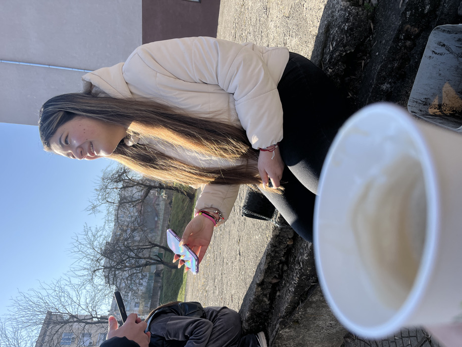 An outdoor scene in Cherven Bryag, Bulgaria, features a young female subject seated on a concrete structure under a clear blue sky. The female, with long brown hair, wears a beige hooded puffer jacket and black pants. She holds a smartphone with an iridescent or holographic case in her left hand, extending it slightly forward. Her left wrist displays multiple colorful bracelets, and her right wrist has a red string bracelet. She looks slightly upward and to the right with a mild smile. To her immediate left, another individual's left arm is visible, holding a dark smartphone vertically, potentially filming or photographing. A third person, wearing a dark grey tracksuit, is partially visible further to the left, also seated on the concrete. In the blurred foreground, a white paper cup with beverage residue is visible, along with a small, grey, rectangular container with dark debris. The background includes a light-colored building wall with a vertical downspout, leafless deciduous trees, and additional multi-story buildings, typical of an urban or semi-urban environment. Strong sunlight casts clear shadows, indicating a bright day.