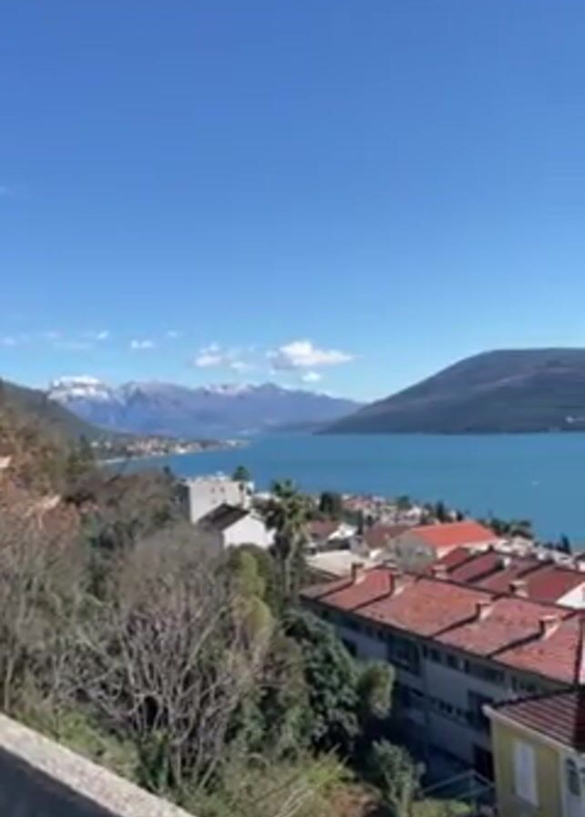 The video presents a landscape view from an elevated position, showing a body of water with mountainous terrain in the background. The water is calm, reflecting a bright blue sky with minimal cloud cover. In the foreground, there are clusters of buildings with red-tiled roofs interspersed with greenery, suggesting a residential area. The angle of the shot is slightly downward, and the camera seems to pan slowly from left to right. The overall scene conveys a sunny, clear day in a coastal town.