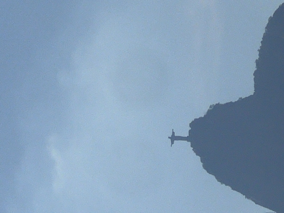 Christ the Redeemer statue perched atop Corcovado Mountain in Rio de Janeiro. The statue is silhouetted against a hazy blue sky. The mountainous terrain is dark and textured. The scene is muted due to atmospheric haze, reducing clarity. The statue faces the viewer, its arms outstretched.