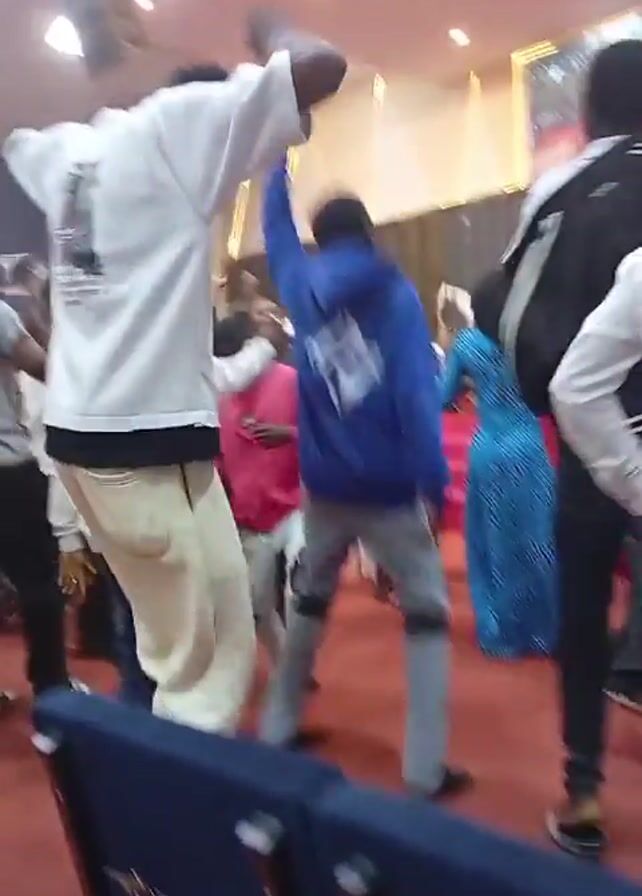 gathering of people inside a large room. Many are wearing traditional African clothing, while others are in more casual attire like jeans and hoodies. People are dancing and moving around, some raising their hands in the air. The atmosphere appears celebratory. The room has rows of blue chairs and a raised platform in the background. There's also evidence of decorations, including fabric draping and lights.