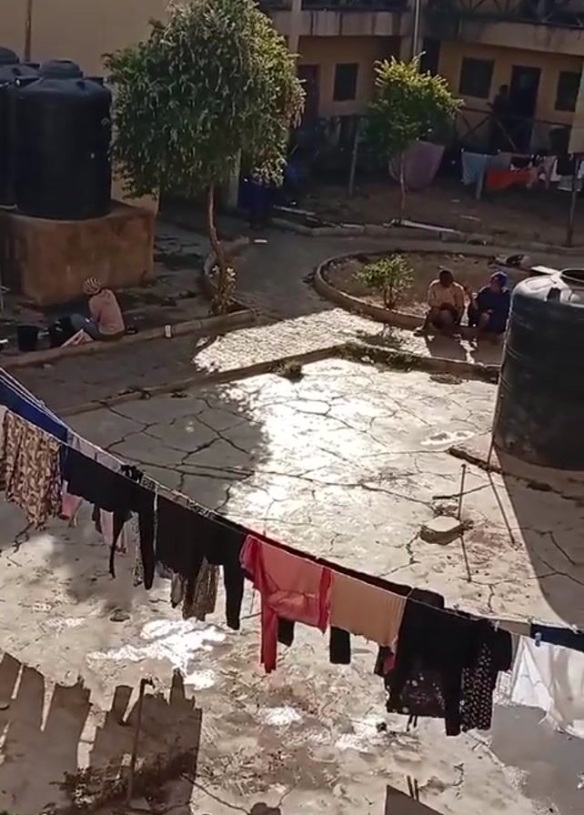 sunny courtyard with a cracked concrete surface, surrounded by a multi-story building. Clothes are hung out to dry on a clothesline that stretches across the foreground. To the left, there are two large black water tanks. Several small trees are scattered throughout the courtyard. In the background, people are gathered in different areas, some sitting and some washing. The video is shot from an elevated position, looking down into the courtyard.