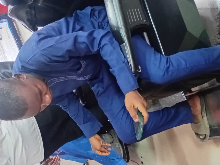 A male individual is depicted seated in a dark, possibly hydraulic-style chair, in an indoor setting identified as Dorayi, Nigeria